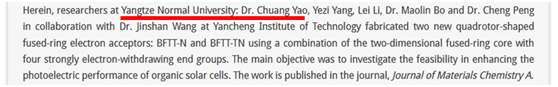 近三年来,在学校和学院各级领导的支持下姚闯博士研究团队陆续在J. Mater. Chem. A;J. Mater. Chem. C;J. Phys. Chem. C等材料科学与工程领域的多个著名期刊上发表关于有机太阳能电池和有机发光二极管中新材料的开发与设计的重要研究成果20余篇。