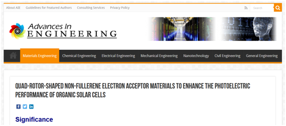 近日,我校材料科学与工程学院姚闯博士与杨叶子、李蕾、薄茂林、彭程教授等发表在J. Mater. Chem. A(影响因子:10.733)的学术论文(Quad-rotor-shaped non-fullerene electron acceptor materials with potential to enhance the photoelectric performance of organic solar cells)被国际著名科技机构“工程进展”(Advances in Engineering, AIE)遴选为关键科学文章,并进行了重点报道。