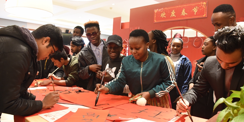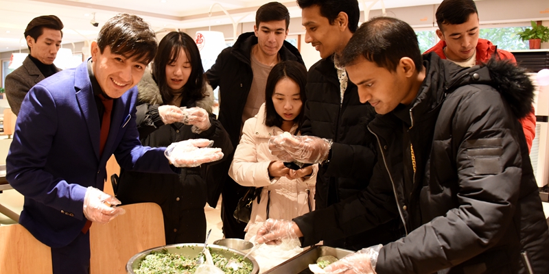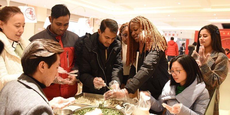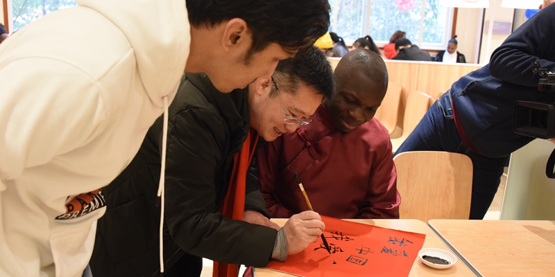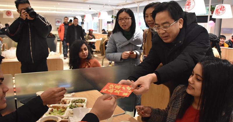 包饺子、写春联、发红包、送“福”字、留学生着唐装迎宾……1月20日,农历大寒,学校“枳园记忆”食堂张贴了春联和20个“福”字,一派喜气洋洋、欢度佳节的温馨气氛。这是学校多年的传统,为寒假留校学生举行新春团拜会,校领导、老师与留校学生同吃团年饭,共迎新春佳节。学校副校长杨双,学生工作部负责人,部分二级学院院长、书记、辅导员出席团年宴,与留校学生欢聚一堂。