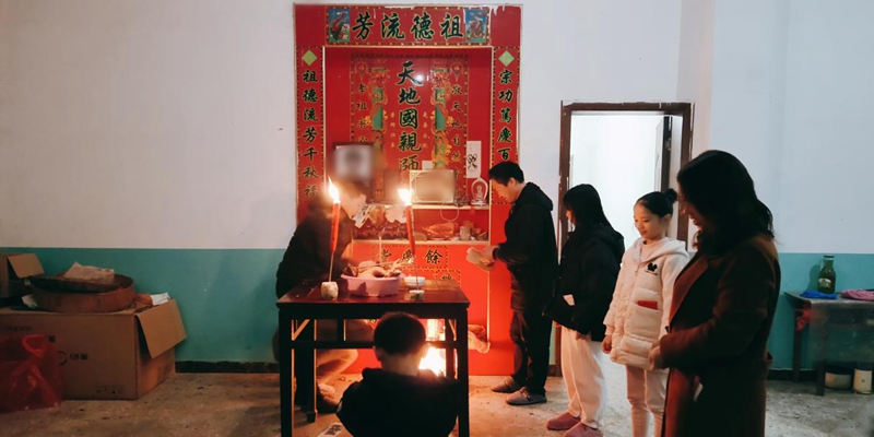 夜晚的新化县灯火弥漫,在春节的喜庆氛围中显得格外耀眼,每家每户亮着的灯彼此渲染,共同营造欢乐的氛围。图为某同学一家人正燃烛焚香祭奠祖宗、祈福来年。