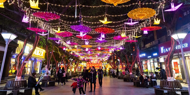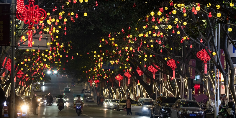 重庆市南岸区南大街两旁的树上张灯结彩,为偌大的城市装点华彩亮色。