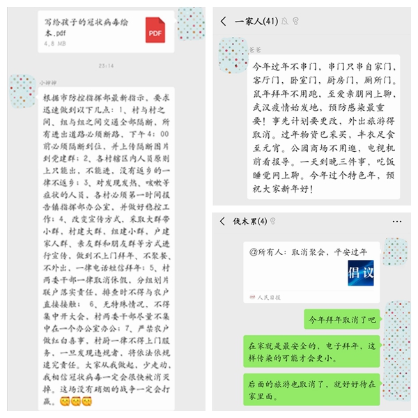 团团圆圆与热热闹闹是传统春节的景象,而今年的春节却格外不同。因为受到新型冠状病毒性肺炎的影响,武汉一同学的家人通过新闻和村委的宣传认识到了疫情的严重性,一致决定将今年的走访拜年改为网络拜年,并不时在群里转发疫情的防护措施,用实际行动为武汉助力加油、为抗击疫情尽好己责。