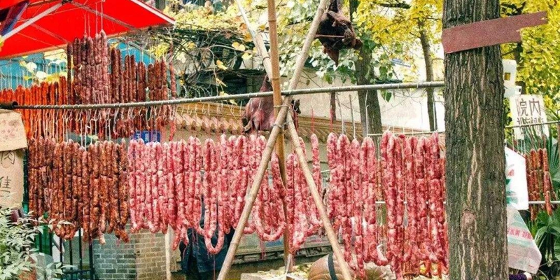 每逢过年,香肠是餐桌上必不可少的一种家乡美味。图中,一同学家中的竹竿上挂满了香肠。