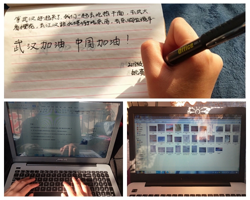 姚爽书写“武汉祝福语”以及收集整理班级祝福语
