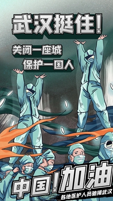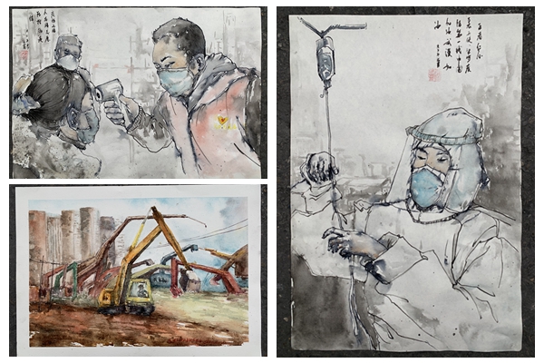 美术学院2014级学生张龙毕业后担任美术教师,在防疫期间,他创作了三幅作品向前线工作人员致以敬意。张龙表示,一线医护人员奋斗在前线、全国人民纷纷投入这场“战疫”中,“众志成城、共抗疫情”“中国加油!武汉加油!”等振奋人心的口号深深地打动了他。因此,作为一名中共党员的他,想利用自己的所学向坚守在一线的工作人员表达敬意。