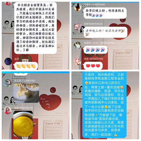 文学院2019级汉语言文学师范专业6班通过QQ群举行了班会,班级33名学生均是转专业学生,这是大家第一次“见面”。隔着屏幕,每个人用文字自我介绍、相互分享寒假趣事,更分别展示了口琴、唱歌等才艺,班级群里气氛十分活跃,特殊的班会形式让素未谋面的同窗逐渐靠近。