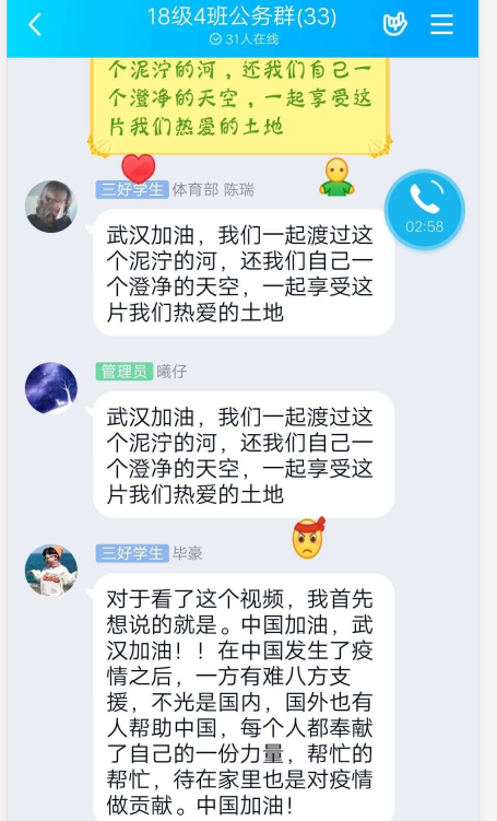 大数据与智能工程学院2017级学生黄涟利说道:“受新冠病毒的影响,我们以特殊的方式团聚,这次班会以语音的方式进行,听到大家熟悉的声音,就好像真的见到了彼此一样,希望疫情早点过去,能回到学校见到老师和同学。”