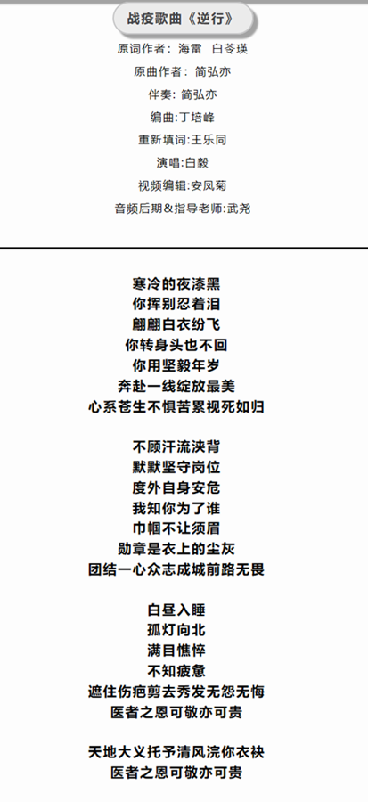 我校教师教育学院2019级学生王乐同被一线医护人员的事迹震撼,爱好文学和音乐的她,决定为抗击疫情填词一首,唱响对白衣战士们的敬仰和感激。“医务工作者们忙碌的身影在我脑海反复出现,他们是英雄、是战士!”王乐同说道。在学院老师武尧的指导下,她迅速完成了歌词创作,并命名《逆行》,音乐伴奏则选择了《不染》。为了歌词与音乐融合,呈现最佳的效果,师生俩不断进行线上交流,积极找寻合适的同学进行演唱,只想早一点将歌曲奉献给前线的医护人员。经过八天不分昼夜的打磨,一帧一帧的选材,最终完成了音乐定稿,并由我校机器人工程学院2019级学生安凤菊完成MV制作。