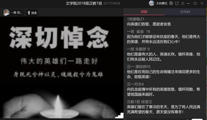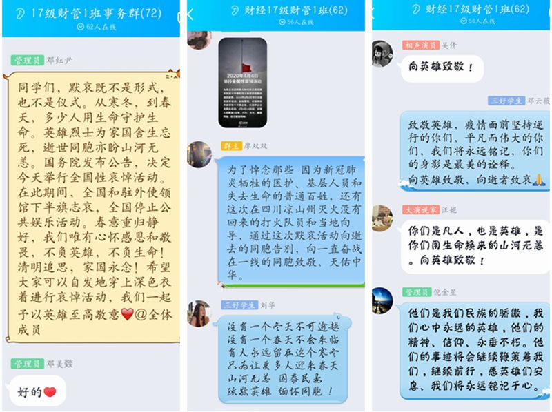 我校两万余名师生以各种形式进行默哀致敬,部分学院组织全体师生通过网络集体“云默哀”,部分师生在家中自发为抗击疫情牺牲的烈士和逝世同胞默哀。默哀仪式后,各学院通过视频会议、“云班会”等组织同学们畅谈感想,加强爱国主义教育和生命教育。