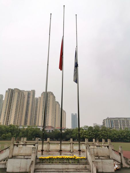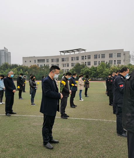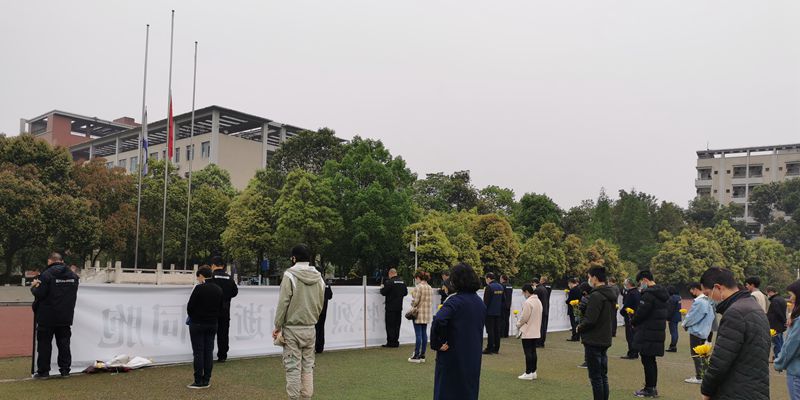 上午,学校行知体育场气氛庄严肃穆,旗杆上降下半旗,操场上放置着白底黑字横幅“深切哀悼抗击新冠肺炎疫情斗争牺牲烈士和逝世同胞”。学校副校长杨双,党委常委何海燕、盛全生等同志,部分教职工、留校学生手持黄菊、戴着口罩,神情凝重地面向五星红旗肃立。十点整,防空警报拉响,全体同志鞠躬默哀,向牺牲烈士和逝世同胞表达深切哀悼。