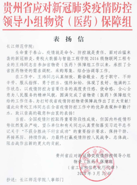 新型冠状肺炎疫情防控战役全面打响后,贵州省面向社会发布招募防控疫情应急志愿者动员令,在贵州省疫情领导小组的统筹安排下,团省委在全省5000多名志愿者中遴选部分高校志愿者到省疫情领导小组医药物资保障组开展志愿服务工作,我校2016级物联网工程专业学生、学生第一党支部党员王玮便是其中一员。王玮主要负责协助汇总收集各地州、各成员单位、各工作组和其它单位有关疫情防控物资的需求,联络协调各工作组下发相关的公文工作等。