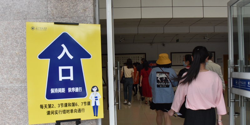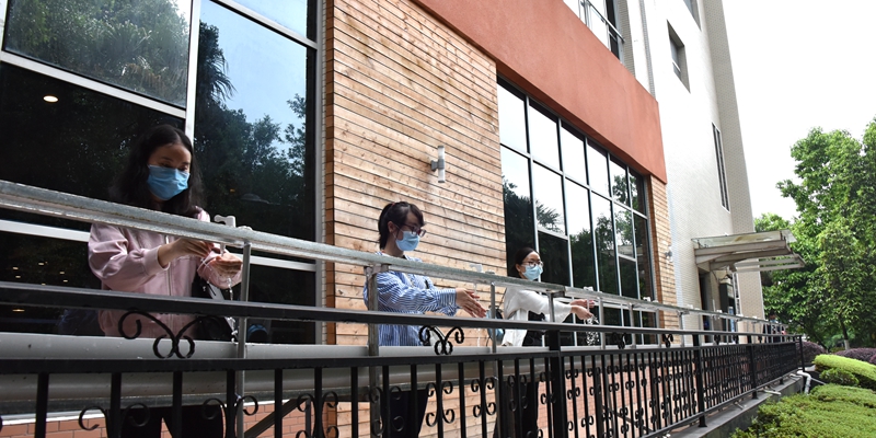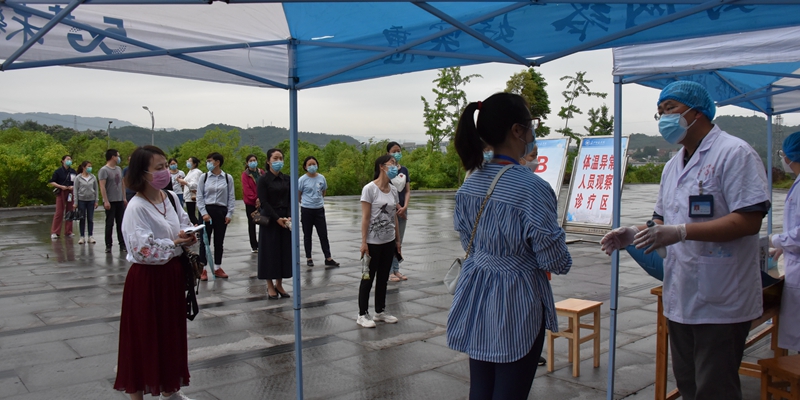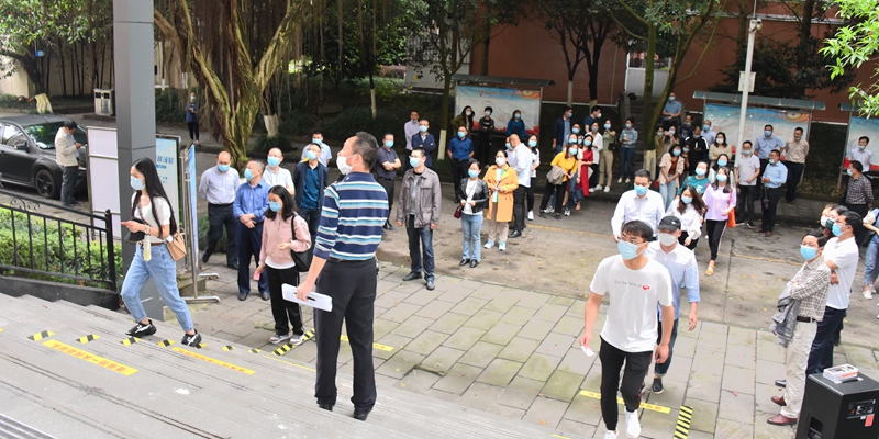 按照预定安排,全体参演教师在南门列队就位,模拟学生返校入校流程,老师们间隔1米有序进入通道,经过体温检测和消毒液消毒后,再到所在学院查验“渝康码”或个人健康证明,并分别模拟了“体温正常者入校流程”“体温异常者查验流程”“经医护人员第三次体温检测”三种情况。