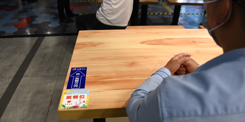 在北苑食堂,全体演练人员间隔1米排队等候,并在临时洗手点洗手后进入食堂。进入食堂后,全体参与人员根据指示牌统一方向就坐,并保持安全距离就餐。