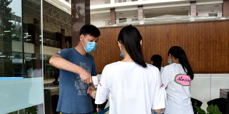 早上8:20分,同学们排好队、保持1米距离有序进入各教学楼。虽然人流量大,但在导引员和安全标识的指引下,师生在接受体温检测后自觉进入课堂。教室时时传来老师的讲课声、朗朗读书声。