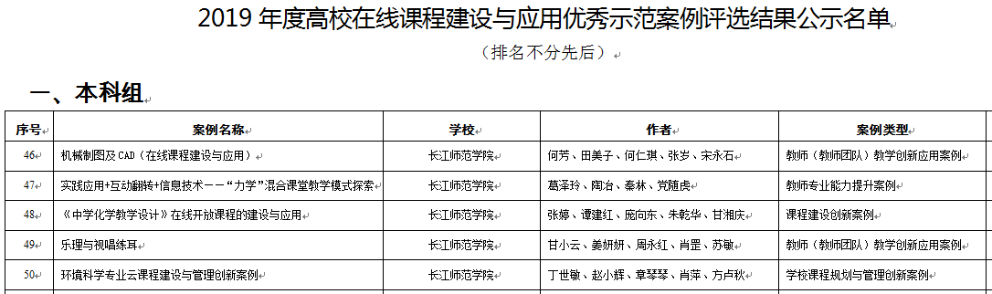 另悉,根据《重庆市教育委员会关于公布2018-2020年度高校在线课程建设与应用先进典型名单的通知》,我校5名教师入选重庆市2018-2020年度高校在线课程建设与应用先进典型。其中,卢凯老师被评为在线课程建设管理先进典型,何树华、何芳、文军3位教师被评为在线教学创新应用先进典型,谭海军老师被评为在线教学支撑服务先进典型。