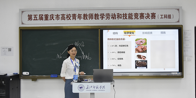 现代农业与生物工程学院教师周琴获得工科组第二名,她通过对肉的颜色变化,形象地讲解了氧合作用的发生,进而对血红素化合物进行了系统讲解。