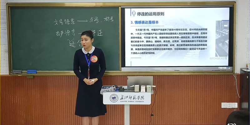 传媒学院教师许芫颜获得文科组第四名,她围绕播音创作基础讲解了“停连”的概念,并分别从标点符号是参考、语法关系是基础、情感表达是根本三方面生动形象地讲授了停连运用的方法。