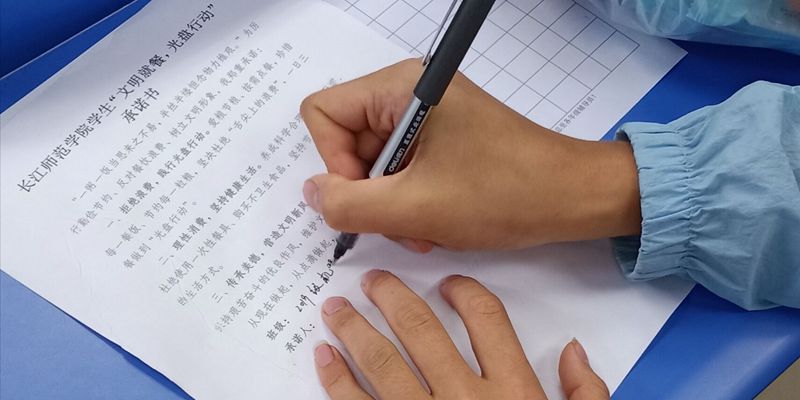 机器人工程学院学子正在“文明就餐,光盘行动”承诺书上签名