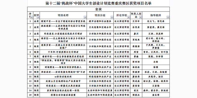 近日,由团市委、市教委、市科协、市学联联合主办的第十二届“挑战杯”中国大学生创业计划竞赛重庆赛区决赛落下帷幕。我校参赛的15件作品荣获金奖3项、银奖4项、铜奖8项。其中,大数据与智能工程学院王华年团队的项目《隧隧平安——专注于隧道的综合管控系统》作为重庆市优秀项目被推荐参与全国决赛。