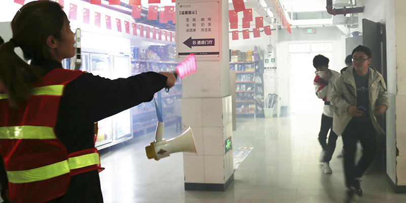 本次演练设置了四个环节:发出警报、投放烟雾、各楼层人员撤离、撤离完毕。在演练过程中,参加演练的学生代表们十分镇定、迅速,在各楼层调度员的指挥下,同学们按照指定路线,弯着腰,捂住口鼻,有序地进行紧急疏散,完全避免了踩踏事故的发生,最后全部撤离到安全地带。
