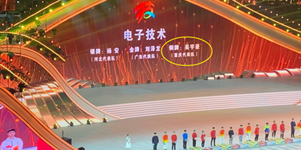 重庆代表队共有97名选手代表参赛,斩获了5枚金牌、4枚银牌、4枚铜牌和46个优胜奖。我校电子信息工程学院2020级学生吴宇豪作为重庆代表队选手参赛。经过激烈的角逐,吴宇豪同学荣获大赛“电子技术项目”组铜牌,被人社部评为“全国技术能手”,并入选第46届世界技能大赛中国集训队。