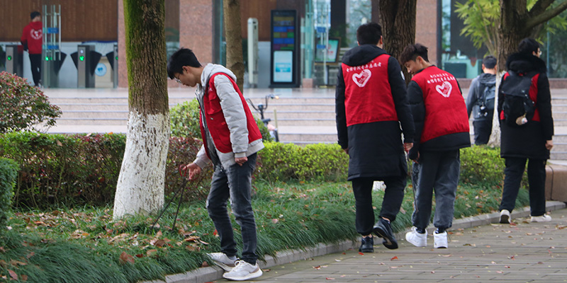 电子信息工程学院在我校正心楼门前开展环境保护、垃圾分类等志愿者活动。志愿者们对地面、花池、水池等进行了彻底的清理。地面的树叶被放入花池内作为肥料,对塑料袋、烟头、纸屑、食品袋等垃圾进行分类后放入垃圾箱。