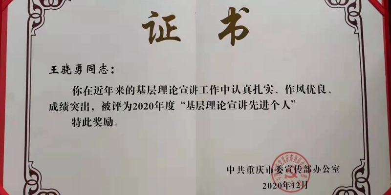 日前,我校退休教师王骁勇被市委宣传部授予“基层理论宣讲先进个人”荣誉称号,以此表彰他在基层理论宣讲工作中的突出贡献。王骁勇同志原任我校物理系主任,1992年加入中国共产党,2006年退休;2012年,王骁勇同志加入涪陵区关工委革命传统教育团,深入基层、校园宣讲习近平新时代中国特色社会主义思想。