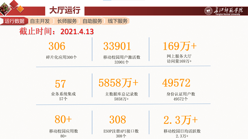 会上,我校信息化办公室负责人从学校一站式服务大厅建设的前期准备、大厅运行、存在问题、未来规划四个方面进行了介绍。他表示,我校集成了57个业务系统和300余个碎片化应用,通过“统一大平台+海量小应用+服务可持续发展的建设模式”,为学校智慧校园平台建设奠定了良好的发展基础。当前,我校一站式服务大厅访问量已超过169万余次,移动校园师生日均活跃率数量达100%。