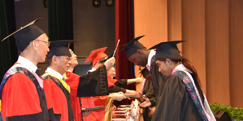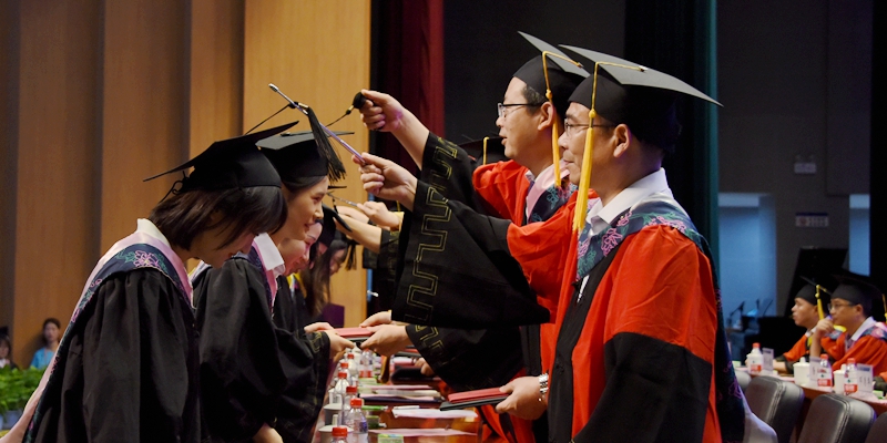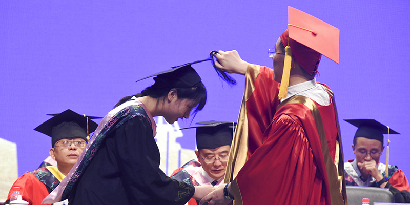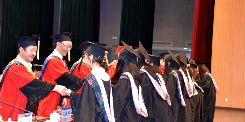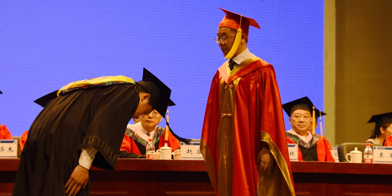 蔡家林为16名获得国家级奖项毕业生代表、20名考取硕士研究生毕业生代表、6名自主创业毕业生代表拨穗正冠,颁发毕业证书、学位证书。
