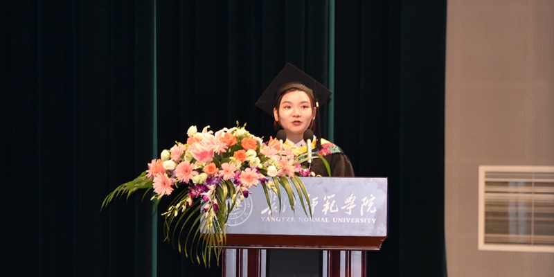 毕业生代表王丹妮向母校与恩师致以崇高的敬意。她表示,四年时光匆匆而过,大学的学习生活教会了她许多道理,让她不断提高自己,从青涩懵懂的少年成长为自信有志的青年。今后,她将秉承“学高身正 敬业自强”的校训,继续发奋学习,不断拼搏,以优异的成绩回报母校。