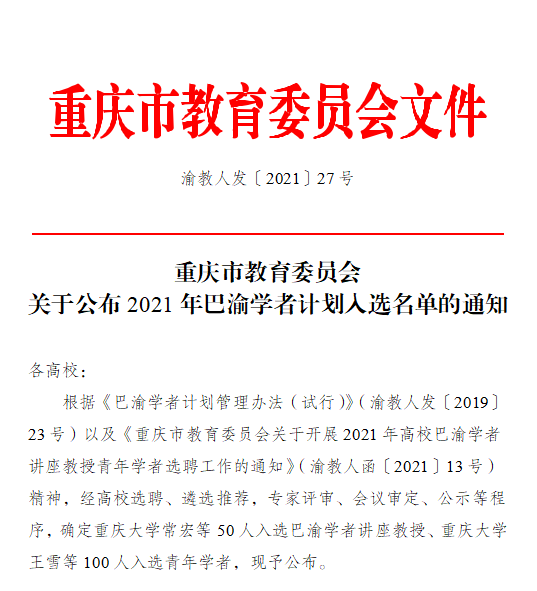 近日,重庆市教育委员会发文公布了2021年度巴渝学者评审结果,我校9名教师获批巴渝学者人才称号,其中,巴渝学者讲座教授、青年学者获批数量均居于我市同生态院校首位。