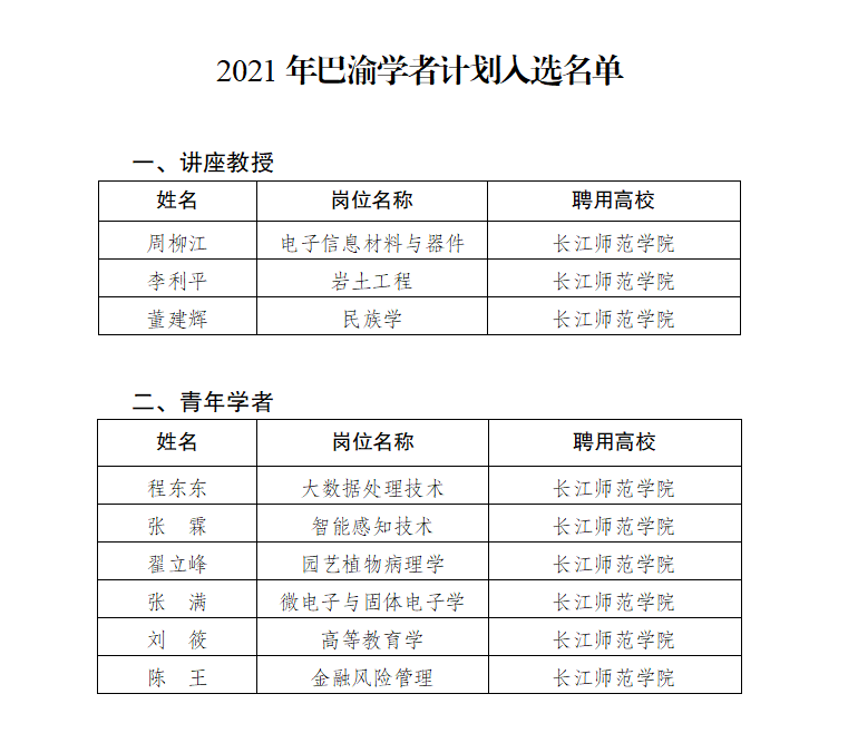 我校3名特聘教授被聘为巴渝学者讲座教授,刘筱、程东东、张霖、翟立峰、张满、陈王等6名青年教师被聘为巴渝学者青年学者。截至目前,我校已有11名巴渝学者特聘教授、9名巴渝学者讲座教授、15名巴渝学者青年学者,巴渝学者总数达到35人。