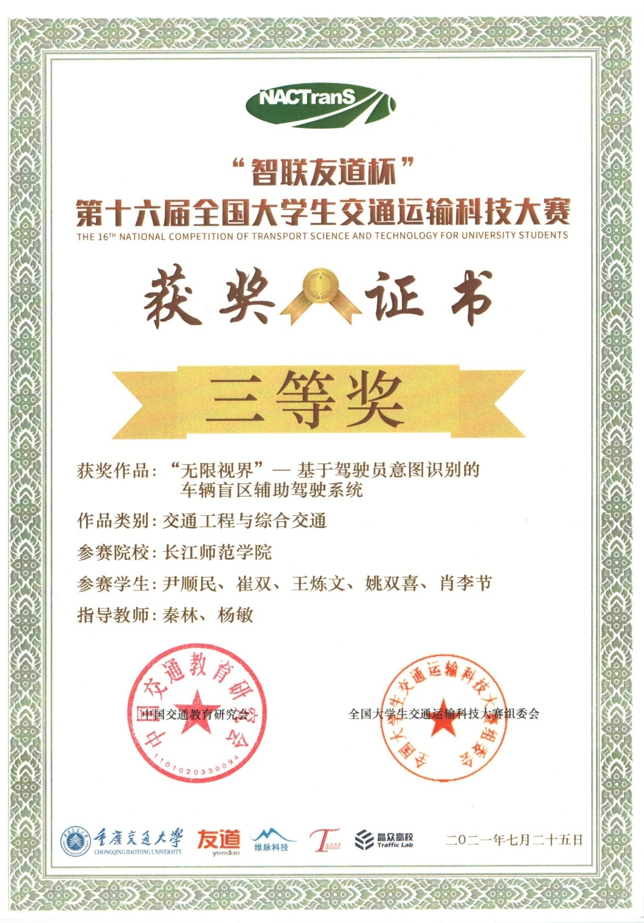 7月25日,第十六届全国大学生交通运输科技大赛在重庆交通大学落下帷幕。我校电子信息工程学院学生团队的项目《“无限视界”— 基于驾驶员意图识别的车辆盲区辅助驾驶系统》荣获全国三等奖,实现了我校在该赛事上零的突破。