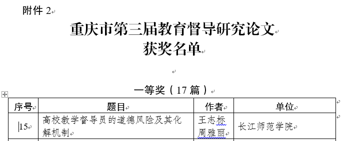 日前,重庆市教育委员会、重庆市人民政府教育督导室组织开展的《第三届教育督导典型案例及研究论文评选》活动圆满结束,我校教师王志标、周雅丽提交的论文“高校教学督导员的道德风险及其化解机制”获教育督导研究论文一等奖;刘开华、向小川、冯伟林提交的论文“基于专业认证理念的‘一流课堂’质量评价体系探索与实践”获二等奖。此外,我校还被评为“重庆市第三届教育督导典型案例及研究论文评选工作优秀组织奖”单位。