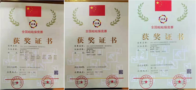 日前,2021-2022年全国啦啦操联赛(重庆站)在重庆市南岸区举行。我校啦啦操队斩获乙组集体自选花球、双人自选花球比赛第一名,并获得了参加总决赛的资格。本次比赛由国家体育总局体操运动管理中心、中国蹦床与技巧协会主办。