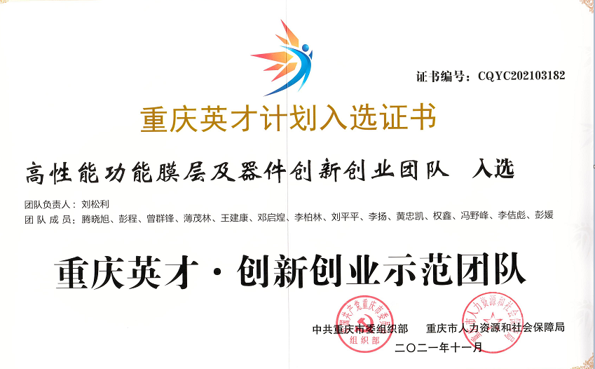 日前,材料科学与工程学院 “高性能功能膜层及器件创新创业团队”成功入选2021年重庆市英才计划·创新创业示范团队。