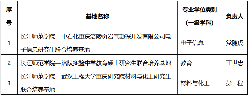 日前,根据《重庆市教育委员会关于开展2021年度重庆市研究生联合培养基地申报工作的通知》,我校“长江师范学院—中石化重庆涪陵页岩气勘探开发有限公司电子信息研究生联合培养基地”等3个基地获批2021年重庆市研究生联合培养基地。具体名单如下: