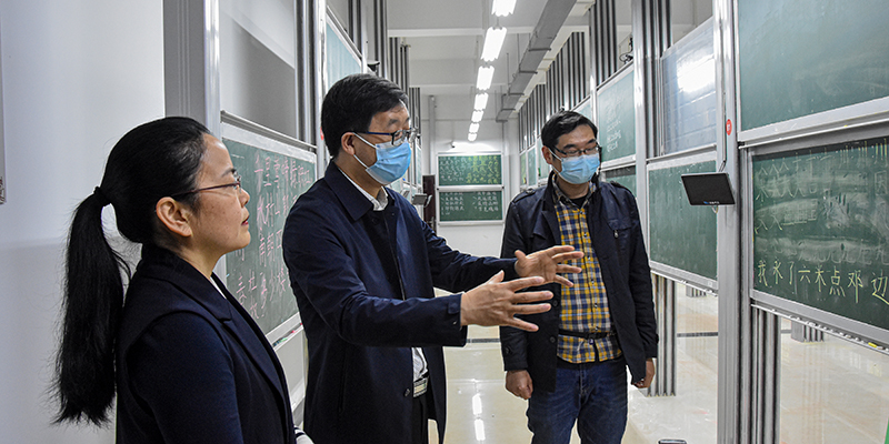 李旭锋一行走访调研了学校教师教育学院的形体与礼仪综合训练室、智能化粉笔训练与测试室、书写技能训练室、智能教学训练室、小学音乐教育实训室等,并高度评价了我校师范教育的师资力量、教学设备、科研平台、培养体系。