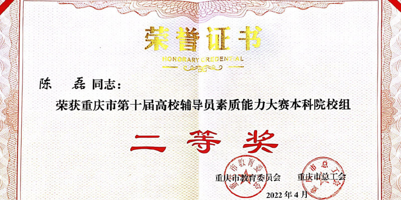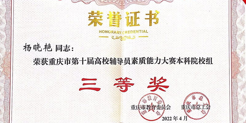 4月25日至27日,由市委教育工委、市教委和市总工会联合主办的重庆市第十届高校辅导员素质能力大赛圆满落幕。我校材料科学与工程学院辅导员陈磊荣获二等奖、马克思主义学院辅导员杨晓艳荣获三等奖。