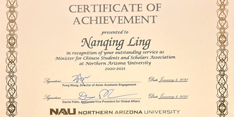 凌楠清荣获2020-2021美国北亚利桑那大学优秀杰出贡献奖