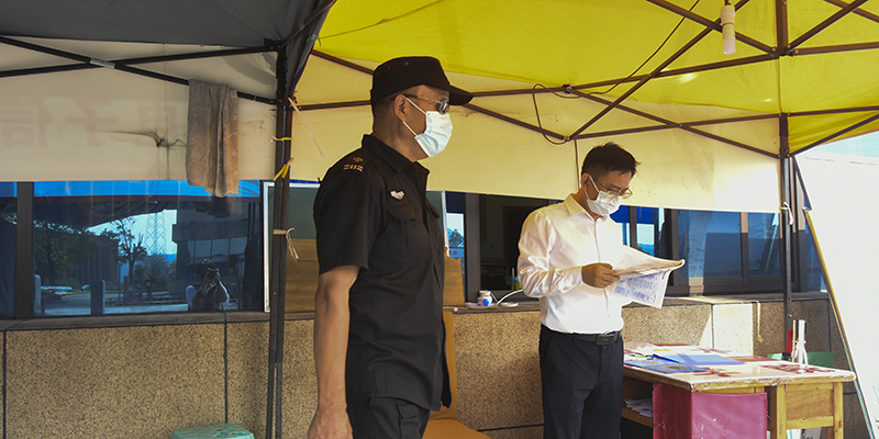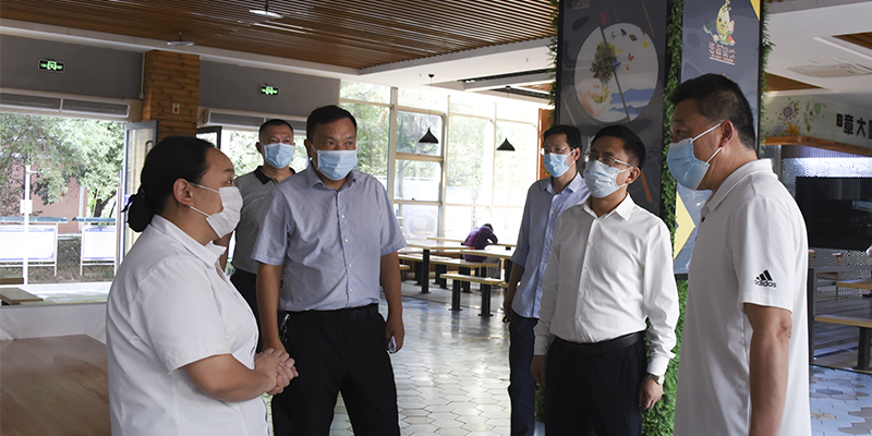 袁革、李柳柏一行先后前往教育超市、北苑食府、北苑学生宿舍、学校校门、危化物品库房等地,实地检查校内疫情防控工作与校内安全措施,对食品储备、人员进出、疫情防控、危险品存放提出明确要求。