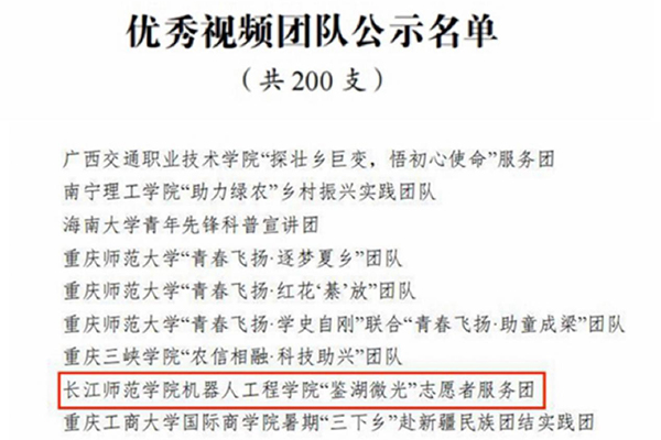 近日,由共青团中央青年发展部、中国青年报、中国青年网共同举办的2022年全国大中专学生志愿者暑期文化科技卫生“三下乡”社会实践“镜头中的三下乡”征集活动公示入选名单。我校机器人工程学院“鉴湖微光”志愿者服务团经过层层遴选,从多支志愿者服务团队中脱颖而出,成功入选优秀视频团队。