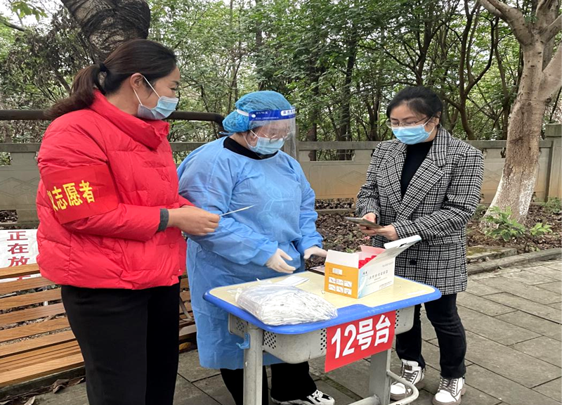 该院教师吴琼先报名成为涪陵区稻香社区的志愿者,每天负责全员核酸检测居民引导、小区定点督查巡逻,还要穿着密不透风的防护服为小区500余人采集核酸样本。虽然志愿服务有风险、很辛苦,但吴琼先心里却充满感动和温暖,每天都充满干劲儿的鼓励小区业主们,在她的影响带动下,她的邻居也主动申请加入社区志愿者队伍中。