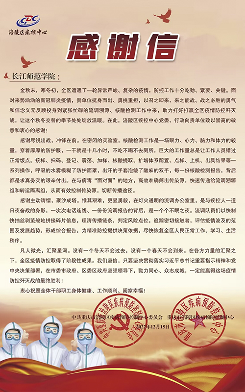 日前,涪陵区疾病预防控制中心向长师发来感谢信,信中对我校青年学子积极响应疫情防控部署、参与联防联控表示了感谢,并赞扬了同学们在志愿服务中的突出表现。此前,我校遴选20名学子组建青年突击队参与涪陵区疫情防控工作,负责电话流调、信息收集、表格制作等,每天志愿服务达12小时,在服务人民群众中彰显青年担当。