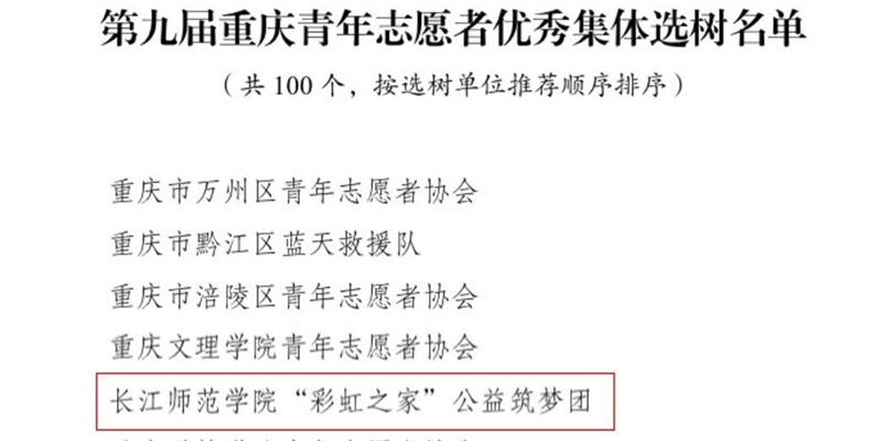 日前,团市委公布了第九届重庆青年志愿者优秀集体、优秀个人选树名单,我校“彩虹之家”公益筑梦团入围第九届重庆青年志愿者优秀集体选树名单,校团委蒋婧琳老师荣获第九届青年志愿者优秀个人称号,获全市通报表扬。