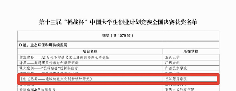日前,由共青团中央、教育部、人力资源和社会保障部、中国科协、全国学联和北京市人民政府主办的第十三届“挑战杯”中国大学生创业计划竞赛在北京落下帷幕。大赛吸引了3011所高校、142.4万名学生参赛,累计提交33万余项创新创业项目,经过校级初赛、省级复赛、全国决赛初评、全国决赛终评等环节比拼,我校美术学院团队项目《创艺巴蜀——地域特色文化创新设计开发》荣获铜奖。