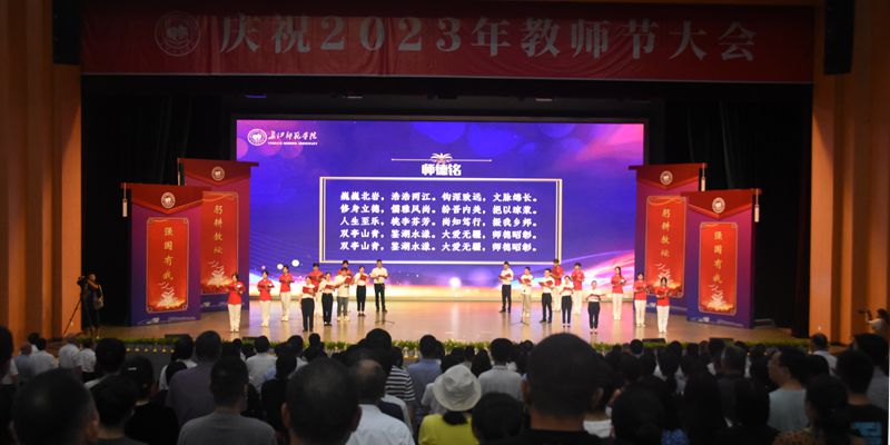 与会教师集体朗诵了《师德铭》。羽韵合唱团唱响《每当我走过老师的窗前》,大会在优美的歌声中落下帷幕。