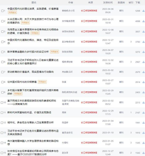 近年来,我校学报以提升期刊影响力导向,围绕期刊评价关键指标抓工作重点,对投稿坚持做到“早定稿、早编辑、早上网”,在栏目建设和选稿方面紧扣国家时政和学术研究热点,利用网络首发、公众号推送、网页宣传、微信群推介等新媒体手段推送刊文,刊文受关注程度不断提升,这些极大地提高了文章的下载次数、转引等期刊影响力指标,尤其是2023年刊文下载次数猛增。