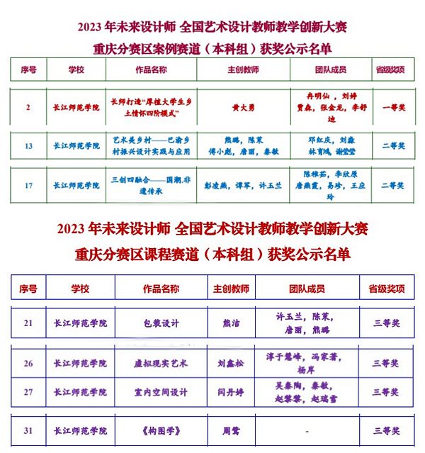 日前,由重庆市高等教育学会主办的“全国艺术设计教师教学创新大赛”重庆赛区竞赛结果公示,我校荣获一等奖1个、二等奖2个,三等奖4个。其中,黄大勇教授、冉明仙教授凝练的“长师打造‘厚植大学生乡土情怀四阶模式’”案例,成功入围国赛遴选。