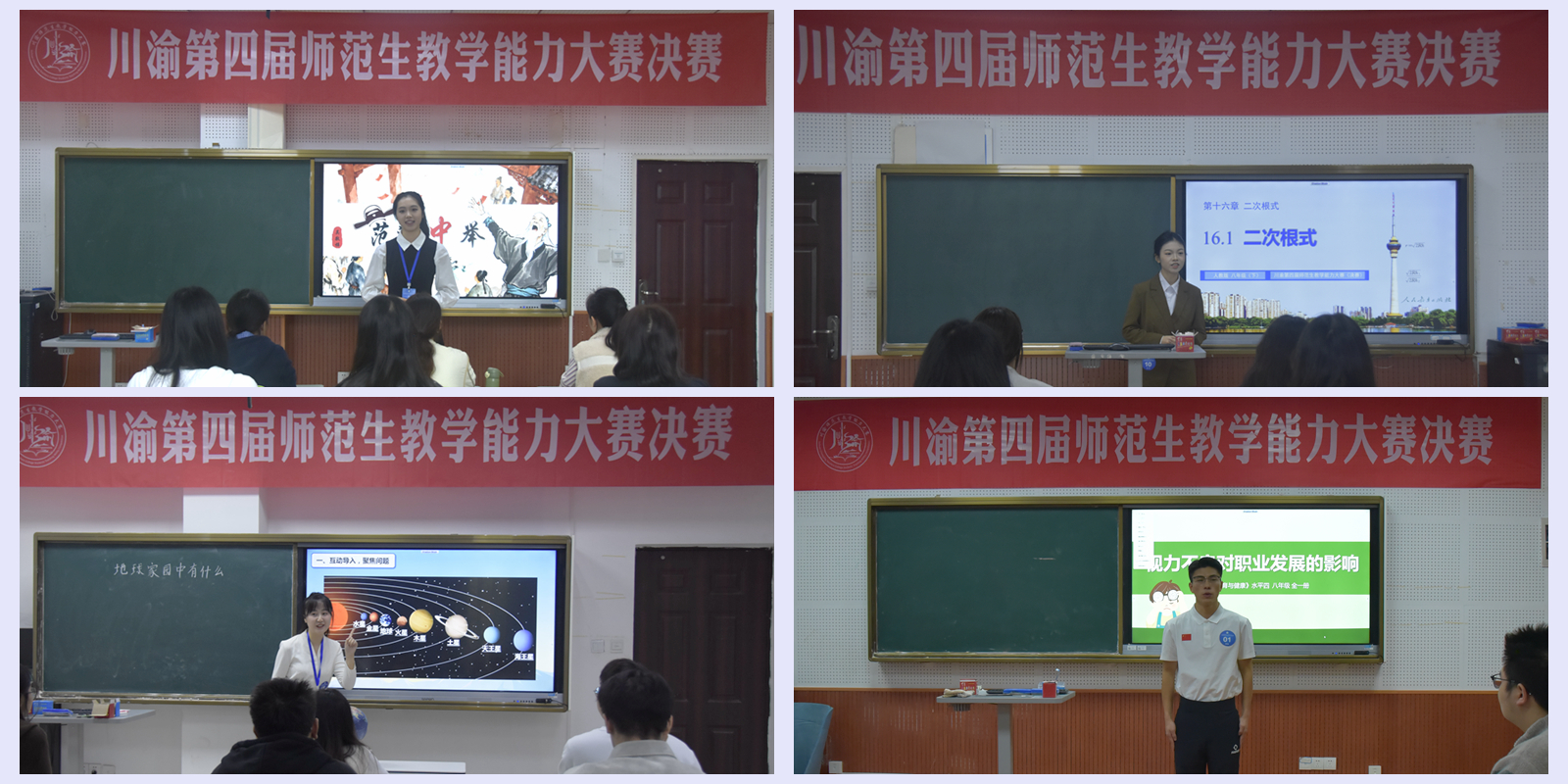 决赛围绕教学设计、多媒体课件制作、即席讲演、模拟授课·板书、现场答辩五个环节展开。参赛选手凭借生动的现场教学、严谨的教学设计与别出心裁的板书设计,依次呈现了多节精彩纷呈的模拟课堂,全方位展示了川渝地区师范生扎实的教学基本功和显著的培养成效。
